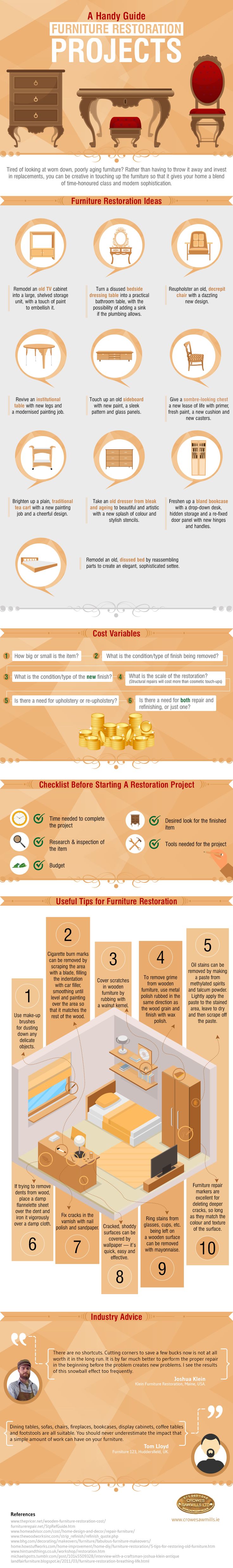 Furniture restoration can be quite fun and is brilliant for letting your creative spark run wild, but it also requires careful thought and considerable planning. It’s important to identify how much work will be needed in the restoration, whether you can carry out this work yourself, whether you have the free time to do the work and, most of all, if it is feasible. The helpful folks at Crowe Sawmills have included some practical tips to take on board if you are undertaking furniture restoration. If it’s something you want to explore more, take a look at the neat infographic below.