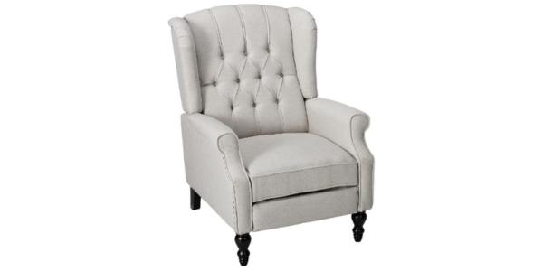 Also, it has a tall back design which helps to relax even better as it has enough support for your back. The seat is upholstered with a soft beige microfiber fabric. This results in a comfy texture which can enhance your relaxation. Dimensions stand at 38.0 inches in height, 31 inches wide with chair depth of 35.75.
